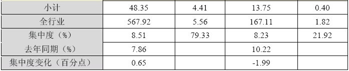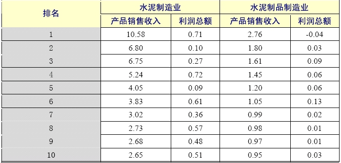 1季度,水泥制造業(yè)前10家企業(yè)銷售收入集中度比去年同期略有提升,利潤集中度則更是高達(dá)近8成。而水泥制品制造業(yè)前10家企業(yè)銷售收入集中度比去年同期則有所下滑,實(shí)現(xiàn)利潤只占行業(yè)總體的2成多。 水泥制造業(yè)前10家企業(yè)銷售收入為48.35億元,集中度為8.51%,比去年同期上升了0.65個(gè)百分點(diǎn),比上季度末上升了3.57個(gè)百分點(diǎn);實(shí)現(xiàn)利潤為4.41億元,集中度為79.33%,比上季度末上升了77.14個(gè)百分點(diǎn)。水泥制品制造業(yè)前10家企業(yè)銷售收入為13.75億元,集中度為8.23%,比去年同期下降了1.99個(gè)百分點(diǎn),比上季度末上升了1.84個(gè)百分點(diǎn);實(shí)現(xiàn)利潤為0.40億元,集中度為21.92%,比上季度末上升了19.95個(gè)百分點(diǎn)。