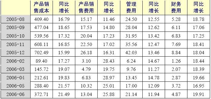 2006年1-6月,水泥制品制造業(yè)累計(jì)產(chǎn)品銷售成本為372.71億元,同比增長21.49%,增幅比上年同期上升了2.73個(gè)百分點(diǎn);累計(jì)產(chǎn)品銷售費(fèi)用為13.04億元,同比增長25.88%;累計(jì)管理費(fèi)用為21.14億元,同比增長11.94%;累計(jì)財(cái)務(wù)費(fèi)用為4.87億元,同比增長19.91%。除了財(cái)務(wù)費(fèi)用增幅低于水泥制造業(yè),其他費(fèi)用增幅均高于水泥制造業(yè),累計(jì)產(chǎn)品銷售成本增幅也低于水泥制造業(yè)。