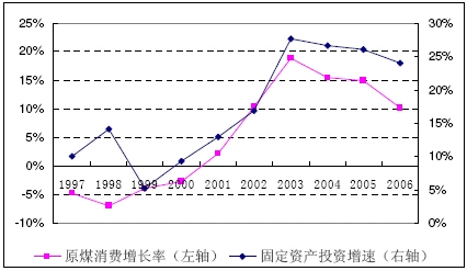 近十年原煤消費(fèi)增速與全社會(huì)固定資產(chǎn)投資增速關(guān)系圖