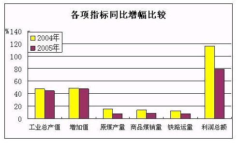 2005年,全國(guó)規(guī)模以上煤炭企業(yè)完成工業(yè)總產(chǎn)值5360億元,同比增長(zhǎng)44.7%,增幅比去年下降了3個(gè)百分點(diǎn);完成工業(yè)增加值2805億元,同比增長(zhǎng)47.9%,雖高于全國(guó)工交行業(yè)增加值增幅36.6個(gè)百分點(diǎn),但僅占全國(guó)規(guī)模以上工業(yè)增加值的4.2%。