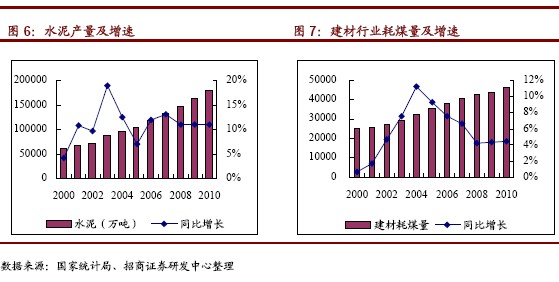 2006 年前10 個月,水泥產(chǎn)量98733。85 萬噸,同比增長20.2%。預(yù)計06 年全年水泥產(chǎn)量為116206 萬噸,同比增長11.92%。消耗煤炭23465 萬噸,加上其他建材耗煤14500萬噸,建材行業(yè)共消耗煤炭37965 萬噸,同比增長7.54%。