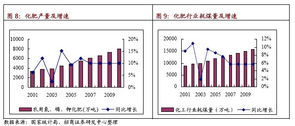 預(yù)計(jì)07 年、08 年化肥產(chǎn)量分別為6022 萬(wàn)噸和6624.4 萬(wàn)噸,同比分別增長(zhǎng)10%和10%?紤]到每年4%的節(jié)能降耗,預(yù)計(jì)07 年、08 年的化肥行業(yè)煤炭消耗量為12634 萬(wàn)噸和13362 萬(wàn)噸,同比增長(zhǎng)5.77%和5.77%。