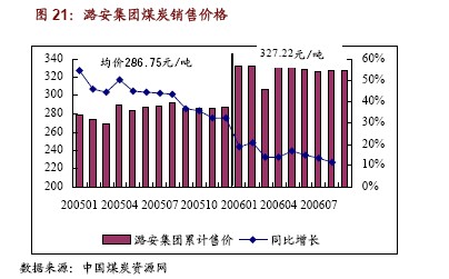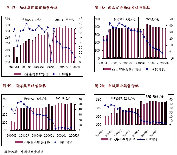 從山西煤炭企業(yè)的銷售價(jià)格來看,2006年前9 個(gè)月,陽煤集團(tuán)、西山礦務(wù)局、同煤集團(tuán)、晉城煤業(yè)和潞安集團(tuán)的銷售價(jià)格分別為306.56 元/噸、381 元/噸、247.19 元/噸、355.69 元/噸和327.22 元/噸,較05 年均價(jià)分別增長8.76 元/噸,-2.41 元/噸(煉焦煤價(jià)格壓力較大)、7.39 元/噸、17.97 元/噸和40.47 元/噸(潞安加大了煙煤噴吹銷量)。除了西山礦務(wù)局的價(jià)格小幅下跌外,其他四大集團(tuán)的價(jià)格都有不同程度的上漲。