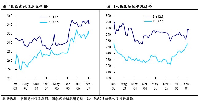 值得關(guān)注的是,華東地區(qū)P.o42.5 水泥價(jià)格分別同比、環(huán)比增長(zhǎng)5.1%、3.2%。華東地區(qū)2006 年和2007 年1 季度水泥行業(yè)投資分別降低19%、14%,其中江蘇、