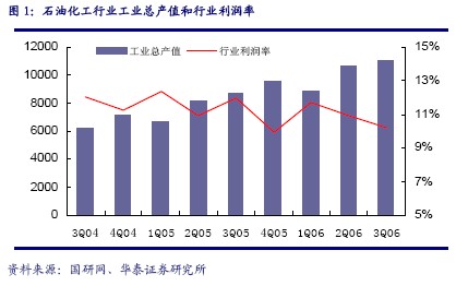 2006 年前三季度,石油化工行業(yè)作為我國(guó)宏觀經(jīng)濟(jì)的基礎(chǔ)和支柱產(chǎn)業(yè),繼續(xù)在自身的發(fā)展慣性作用下保持穩(wěn)定增長(zhǎng),但其增長(zhǎng)速度相對(duì)于2004-2005 年高速增長(zhǎng)期已經(jīng)有所回落。石化行業(yè)工業(yè)總產(chǎn)值已經(jīng)連續(xù)兩個(gè)季度突破萬(wàn)億元大關(guān),但需要關(guān)注的是,行業(yè)利潤(rùn)率在波動(dòng)中已經(jīng)開始出現(xiàn)了下滑的趨勢(shì),預(yù)計(jì)今年石化行業(yè)的行業(yè)利潤(rùn)率在10.5%左右,相比于去年的11.3%下降近一個(gè)百分點(diǎn)。這一利潤(rùn)率指標(biāo)的走向直接反映了石油化工行業(yè)在經(jīng)歷了近期高峰以后,開始進(jìn)入景氣回落周期。