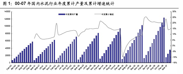2007年1-4月,國(guó)內(nèi)水泥累計(jì)產(chǎn)量為3.59億噸,同比增長(zhǎng)為14.4%,增幅同比下降7.4個(gè)百分點(diǎn),較06年全年增速下降1.1個(gè)百分點(diǎn)。??目前的水泥產(chǎn)量增速仍處于2000年以來的較高水平,預(yù)期07年國(guó)內(nèi)水泥產(chǎn)量增速約12-13%,盡管數(shù)值略低于06年,但仍屬于高增長(zhǎng)的水平。