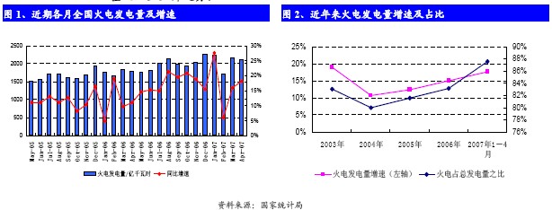 2007年1-4月,全國火電發(fā)電量為8330.9億千瓦時,同比增長17.6%,占全部發(fā)電量的比重高達(dá)87.3%,與06年相比,占比提高了4.2個百分點。從歷史數(shù)據(jù)可以看出,自2004年以來,火電發(fā)電量增速及其占全國總發(fā)電量之比呈上升趨勢。