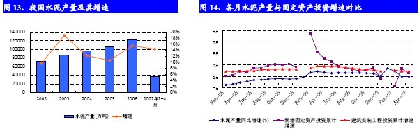 2007年1-4月我國(guó)水泥產(chǎn)量為35909萬(wàn)噸,自年初以來(lái),水泥產(chǎn)量增速處于下降趨勢(shì),從1月份的29%下降到4月份的14.4%。2007年1-4月,全社會(huì)新增固定資產(chǎn)投資增速為20.4%增速環(huán)比下降8個(gè)百分點(diǎn),而與水泥需求關(guān)系更為密切的建筑安裝工程新增固定資產(chǎn)投資增長(zhǎng)較為平穩(wěn),4月份增速為23.7%,環(huán)比僅下降0.5個(gè)百分點(diǎn),與2006年全年增速基本一致。