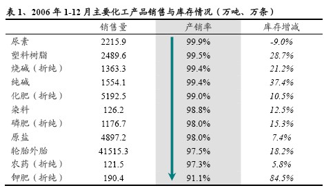 截至到去年12 月底,國內(nèi)大部分化工產(chǎn)品都保持著產(chǎn)銷兩旺的良好勢頭,產(chǎn)銷率多在90%以上。但是鉀肥、塑料樹脂、燒堿、純堿、輪胎、磷肥等產(chǎn)品的庫存增加較大,表明下游需求增速與產(chǎn)量增速仍有一定差距,除鉀肥嚴(yán)重產(chǎn)不足需以外,其他幾類產(chǎn)品都面臨著不同程度的供大于求。