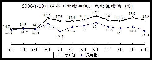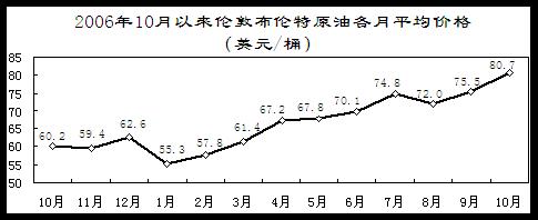當月全國原油產量同比增長1.9%;原油加工量增長6%,增速比上月加快0.3個百分點,其中汽油、柴油產量均增長4.7%。天然氣產量增長24.3%,比上月減緩5.6個百分點。國際原油價格繼續(xù)上漲。當月布倫特原油平均價格80.7美元/桶,比上月上漲5.2美元/桶,同比上漲20.5美元/桶,漲幅分別為7%和34.2%。受國際油價快速上漲、國內油價調整預期增強等影響,部分地區(qū)成品油供應趨緊。1-10月,全國原油產量15573萬噸,增長1.4%;進口原油13668萬噸(海關統(tǒng)計),增長13.8%;原油加工量26993萬噸,增長6.6%,其中汽油、柴油產量分別增長7.7%和5.8%。天然氣產量561億立方米,增長20.1%。乙烯產量增長14.3%,燒堿、純堿產量分別增長15.8%和11%,化肥、農藥產量分別增長13.6%和21.3%。
