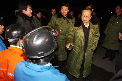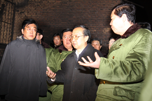 李毅中、省委書記張寶順(右)、孟學(xué)農(nóng)(左)、王顯政在事故現(xiàn)場連夜指揮搶險救援工作