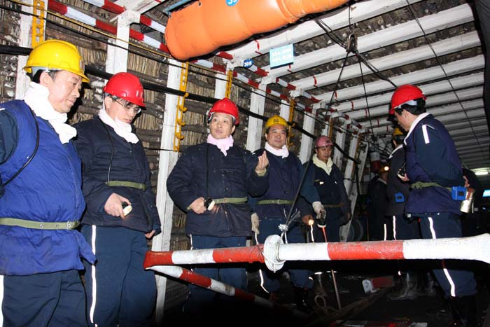 曹榮平一行一到臨渙礦就來(lái)到更衣室,在該礦黨政領(lǐng)導(dǎo)的陪同下,深入井下慰問(wèn)節(jié)日期間堅(jiān)守崗位的臨渙礦職工。曹榮平一進(jìn)罐籠看到不銹鋼罐壁、環(huán)境衛(wèi)生、人性化扶手,高興地說(shuō),從細(xì)微處就能看出臨渙礦標(biāo)準(zhǔn)化工作在不斷的發(fā)生變化。當(dāng)曹榮平置身于臨渙礦井底大巷,看到延綿不斷的壁畫(huà)時(shí),感到耳目一新。他說(shuō),人要改變環(huán)境,反過(guò)來(lái)環(huán)境就能塑造人,這也是臨渙礦質(zhì)量標(biāo)準(zhǔn)化工作上品位、上檔次的表現(xiàn)。臨渙礦井底車(chē)場(chǎng)處處都有人性化手筆,明顯的標(biāo)識(shí)、標(biāo)志、反光提醒牌、橫跨軌道的警示條,處處彰顯著人性化管理。認(rèn)為臨渙礦在質(zhì)量標(biāo)準(zhǔn)化創(chuàng)建中,真正動(dòng)了腦筋、下了功夫。每到一處,曹榮平在肯定臨渙礦安全質(zhì)量標(biāo)準(zhǔn)化創(chuàng)建取得成績(jī)的同時(shí),也就存在的問(wèn)題提出了指導(dǎo)性意見(jiàn)。隨后,曹榮平一行又乘車(chē)來(lái)到東三采區(qū)掘進(jìn)三區(qū)施工的931風(fēng)巷,看望慰問(wèn)那里堅(jiān)守崗位的職工。掘進(jìn)三區(qū)施工的140余米巷道一路燈火通明,環(huán)境衛(wèi)生、各類(lèi)安全設(shè)施齊全可靠,在接近迎頭時(shí),迎面的是掘進(jìn)三區(qū)職工井下休息室,曹榮平步入室內(nèi)看到鮮花盛開(kāi)、牌板齊全、溫馨的安全提示、幽雅的休息環(huán)境,真正體現(xiàn)出對(duì)職工的關(guān)懷。曹榮平關(guān)切地詢(xún)問(wèn)著當(dāng)班職工安全生產(chǎn)情況,在捕車(chē)器旁,他要求隨行的臨渙礦領(lǐng)導(dǎo),結(jié)合實(shí)際制定好“兩節(jié)”期間的具體工作安排,統(tǒng)籌好安全與生產(chǎn)、安全與其它各項(xiàng)工作的關(guān)系,加強(qiáng)領(lǐng)導(dǎo),精心組織,明確任務(wù),落實(shí)責(zé)任。把“兩節(jié)”期間的安全工作與貫徹落實(shí)集團(tuán)公司工作會(huì)議與安全工作會(huì)議精神結(jié)合起來(lái),使“兩節(jié)”期間的安全工作井然有序。加強(qiáng)管理人員帶班制度,嚴(yán)禁空班、漏班。在931掘進(jìn)頭,曹榮平認(rèn)真檢查了工程質(zhì)量,他說(shuō)今年臨渙礦申報(bào)了質(zhì)量標(biāo)準(zhǔn)化示范礦井,我持有疑問(wèn),沒(méi)想到通過(guò)一路的檢查、走看,臨渙礦安全質(zhì)量標(biāo)準(zhǔn)化發(fā)生了這么大的變化,有許多做法在全公司值得推廣學(xué)習(xí)。我礦領(lǐng)導(dǎo)韓流、楊軍、朱世奎、周曙光等陪同曹榮平一行到井下慰問(wèn)。