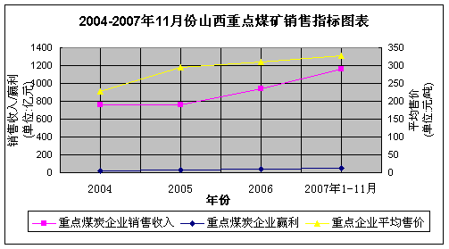 2004-2007年11月份山西重點煤礦生產(chǎn)量平均增長率為18.25%,銷售收入平均增長率為25.11%,企業(yè)盈利平均增長率為47.59%,平均售價平均增長率為14.82%。以上山西重點煤礦銷售指標看出,企業(yè)的盈利平均增長率呈現(xiàn)較快增長,銷售收入增長率亦呈現(xiàn)較快增長,而平均售價的平均增長率僅為14.82%。