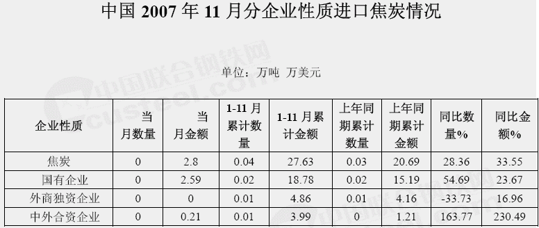 2007年11月份我國焦炭進(jìn)口分企業(yè)性質(zhì)數(shù)據(jù)統(tǒng)計(jì)情況