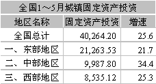 今年1~5月份,全國(guó)城鎮(zhèn)固定資產(chǎn)投資40,264.20億元,同比增長(zhǎng)25.6%,其中房地產(chǎn)投資9,519.28億元,同比增長(zhǎng)31.90%。
