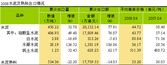 截止2008年5月底,水泥累計(jì)出口456.22萬(wàn)噸,增速達(dá)52.78%。水泥熟料出口增速下降,出口534.36萬(wàn)噸,增速為-22.20%。