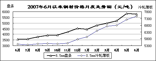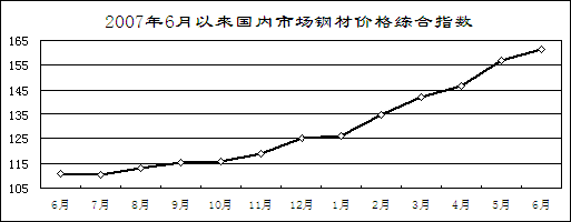 鋼材價(jià)格持續(xù)上漲。6月末,國內(nèi)市場鋼材價(jià)格綜合指數(shù)161.47點(diǎn),為歷史最高水平,比年初上漲36.35點(diǎn),同比上漲50.76點(diǎn)。6.5mm盤條、16mm鋼筋價(jià)格分別為5777元/噸和5552元/噸,同比分別上漲62.4%和60.6%;10mm中板、0.5mm冷軋薄板價(jià)格分別為6793元/噸和7479元/噸,同比上漲53.2%和38.3%。前五個(gè)月,冶金行業(yè)實(shí)現(xiàn)利潤1426億元,增長50.8%。