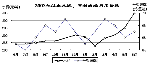 建材產(chǎn)品生產(chǎn)減速,水泥價(jià)格上漲較快。上半年,全國水泥產(chǎn)量64805萬噸,同比增長8.7%,增速同比減緩7.3個(gè)百分點(diǎn);平板玻璃產(chǎn)量27520萬重箱,增長12.2%,減緩5.6個(gè)百分點(diǎn)。水泥價(jià)格快速上漲,平板玻璃價(jià)格高位波動(dòng)。重點(diǎn)建材企業(yè)水泥平均出廠價(jià)6月份為305元/噸,比上月上漲10元/噸,同比上漲21元/噸;平板玻璃出廠價(jià)67元/重量箱,比上月上升1元/重量箱,同比上升2元/重量箱。前五個(gè)月,建材行業(yè)實(shí)現(xiàn)利潤361億元,增長43.6%。其中,水泥行業(yè)利潤84.1億元,增長65.4%;平板玻璃行業(yè)利潤5.7億元,增長25.4%。