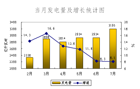 受經(jīng)濟增長放緩需求減弱、電煤供應(yīng)持續(xù)緊張、嚴(yán)重災(zāi)害以及奧運等因素影響,2008年二季度以來,全國規(guī)模以上電廠發(fā)電量增速回落,特別是6月、7月的當(dāng)月增速回落更加明顯。6月和7月,全國規(guī)模以上電廠分別完成發(fā)電量2934億千瓦時和3195億千瓦時,同比分別增長8.3%和8.1%,增速分別比5月當(dāng)月增速下降3.5和3.7個百分點。