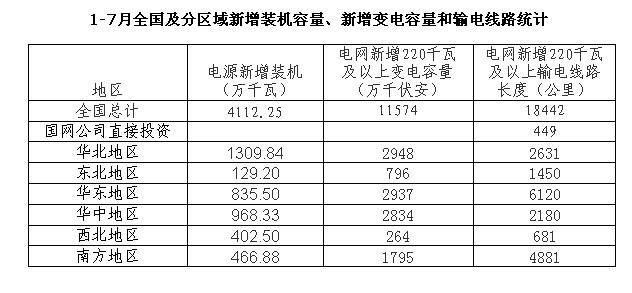 1-7月全國及分區(qū)域新增裝機容量、新增變電容量和輸電線路統(tǒng)計