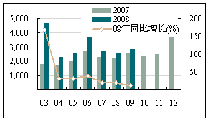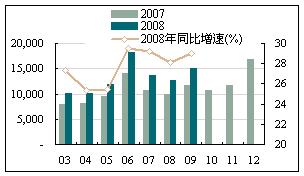 從投資狀況來看,除了內(nèi)蒙古、上海、山東外,其他各地區(qū)的固定資產(chǎn)投資環(huán)比增長率基本恢復(fù)正增長:奧運會禁止施工的后續(xù)影響在逐步消除,北京及周邊各地區(qū)正處于逐步恢復(fù)的狀態(tài);山東省始終沒有改變其環(huán)比增速的負(fù)增長狀態(tài):-17.48%(7月)、-25.23%(8月)、-18.17%(9月),累計完成額為9593.56億元,同比增長22.30%,占全國比重9.61%,居首位。