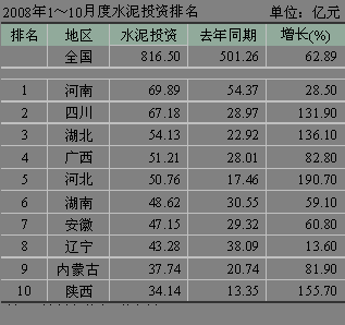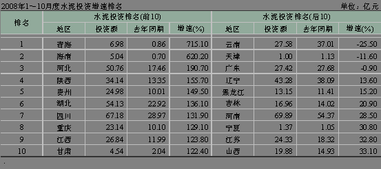 河北省受曹妃甸開發(fā)等因素拉動,水泥投資勢頭迅猛,1~10月份累積水泥投資額達(dá)到了50.76億元,同比增長190.70%,排名第三。