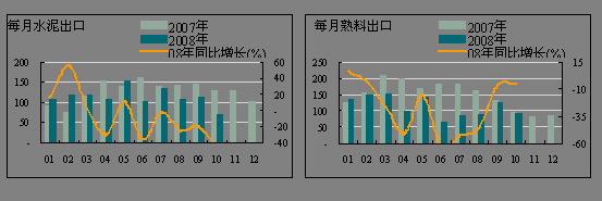 受金融危機的影響,全球經(jīng)濟(jì)增長放緩,對水泥需求減緩,影響水泥產(chǎn)品的出口。10月份的水泥出口量進(jìn)一步減少,僅為68.15萬噸,環(huán)比下降39.71%,同比下降46.94%,較9月份下降近26個百分點;水泥熟料出口91.81萬噸,環(huán)比下降26.93%,同比下降5.17個百分點。