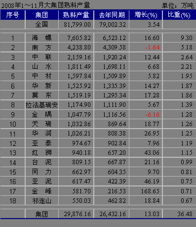2008年1~11月全國水泥大集團(tuán)熟料產(chǎn)量統(tǒng)計(jì)