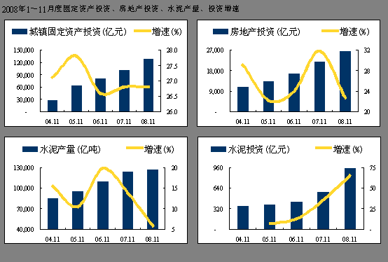 受國際金融風(fēng)暴在下半年影響深化,從前11個(gè)月的數(shù)據(jù)來看,我國固定資產(chǎn)投資增速繼續(xù)回落:2008年1~11月份,共完成固定資產(chǎn)投資127,614億元,同比增長26.80%,名義增長率與2007年基本持平 (若扣除原材料成本上漲因素,投資增速要低于2007年同期)。其中房地產(chǎn)投資回落幅度明顯,1~11月份投資26,546億元,同比增長22.72%,較2007年同期增速下降了9.1個(gè)百分點(diǎn)。