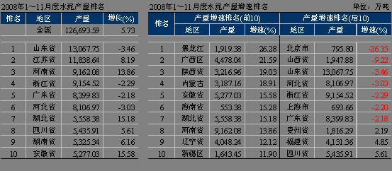 固定資產(chǎn)投資趨緩使大部分地區(qū)四季度的水泥需求旺季并未如期啟動(dòng),產(chǎn)量較8月份進(jìn)一步下滑:1~11月水泥產(chǎn)量12.67億噸,同比增長5.73%,增速較同期減緩8個(gè)百分點(diǎn)。地區(qū)分布上,黑龍江、廣西、陜西、內(nèi)蒙古受區(qū)域內(nèi)經(jīng)濟(jì)拉動(dòng),增速在15%以上,河南水泥產(chǎn)量達(dá)到9,162萬噸,排名首次沖進(jìn)全國三甲;7個(gè)省出現(xiàn)負(fù)增長,產(chǎn)量大省山東、浙江、廣東和河北均在其中,是產(chǎn)量增速下降的主要原因。