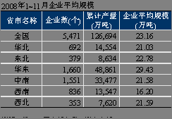 總產(chǎn)量增速趨緩,而企業(yè)數(shù)目的增多,使水泥企業(yè)平均規(guī)模略有下降。1~11月,全國企業(yè)平均規(guī)模為23.16萬噸,較2007年同期下降了0.54個(gè)百分點(diǎn)。除華東地區(qū)水泥企業(yè)平均高于全國平均水平外(1~11月為29.43萬噸),其他五大區(qū)域的企業(yè)規(guī)模均小于全國平均水平,以西南地區(qū)最為明顯,僅為16.20萬噸。