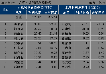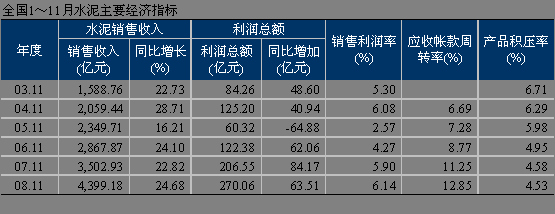 國際金融危機(jī)的波及考驗(yàn)著各個(gè)產(chǎn)業(yè),鋼鐵、有色金屬、化工等紛紛落馬,價(jià)格普現(xiàn)深跌,甚至面臨整體虧損的困境。透析1~11月份水泥運(yùn)行數(shù)據(jù),水泥產(chǎn)業(yè)利潤在成本上升、市場下行的背景下,卻走出一輪逆勢而上的行情,取得了驕人的業(yè)績。