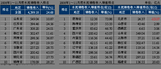 1~11月,水泥產(chǎn)業(yè)實(shí)現(xiàn)銷售收入4,399.18億元,同比增長24.68%,較2007年提高2個(gè)百分點(diǎn)。除北京由于奧運(yùn)影響,是各省市中唯一的銷售收入負(fù)增長區(qū),其他的省份的銷售收入均出現(xiàn)不同幅度的提高。