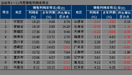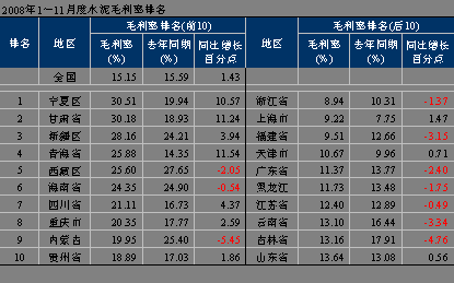 1~11月全國水泥銷售毛利率為15.15%,和2007年基本持平。可以說,今年煤炭、燃油成本的大幅上漲被消化,轉(zhuǎn)移到下游產(chǎn)業(yè);經(jīng)濟(jì)形勢下挫仍然沒有阻止水泥產(chǎn)業(yè)盈利能力提高的腳步。毛利率排名前10中,除海南、內(nèi)蒙古外,都分布在西北和西南;排名后10個(gè)地區(qū)中,華東地區(qū)占了5個(gè)。