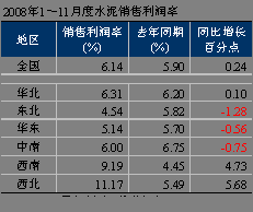 從發(fā)布數(shù)據(jù)看,今年西北、西南的利潤率表現(xiàn)要好于其他地區(qū)。主要是由于這些區(qū)域內(nèi)受基礎(chǔ)設(shè)施、能源基地建設(shè)等因素拉動(dòng),水泥需求旺盛;而華東、中南地區(qū)受成本上升、市場下行的影響,利潤率較2007年略有所下降。