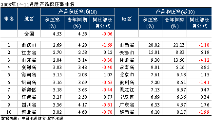 水泥產(chǎn)品積壓率最低前10的地區(qū)均在4%以下,較上個(gè)季度又有所降低:排名第一的重慶,由于本地市場需求旺盛以及受四川災(zāi)后重建啟動(dòng)影響;而山東、安徽等很多地區(qū)的企業(yè)及時(shí)調(diào)整生產(chǎn)節(jié)奏,控制庫存,面對市場下行的趨勢有效地解決產(chǎn)品積壓的問題。水泥產(chǎn)品積壓率最高的前10地區(qū)中,山西省以積壓率20.02%為最,比2007年同期微降1.10個(gè)百分點(diǎn)。