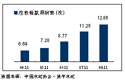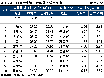 隨著銷售收入的快速增長,1~11月應(yīng)收賬款有所上升,為366.51億元,同比上升了12.09%,上升幅度在合理范圍。應(yīng)收賬款周轉(zhuǎn)率卻較2007年同期加快1.6次,達(dá)到12.85次[1]。在應(yīng)收賬款周轉(zhuǎn)率排名前10的地區(qū)中,貴州的應(yīng)收賬款最低為5.41億元,周轉(zhuǎn)率29.20次,居全國首位,較2007年同期提高13.82次;浙江和江蘇的應(yīng)收賬款周轉(zhuǎn)率較高,分別為23.52次和17.34次,說明沿海的水泥大省對資金回收非常重視。
