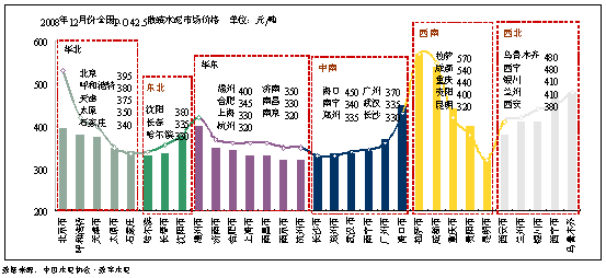 截止2008年12月,根據(jù)數(shù)字水泥網(wǎng)對全國31個(gè)城市水泥價(jià)格的跟蹤情況顯示,全國水泥市場平均價(jià)格P.O42.5散裝383元/噸,與2007年同期325元/噸相比,增長17.64%。增長幅度最大的是西寧、銀川、重慶、蘭州和濟(jì)南,均在40%以上。