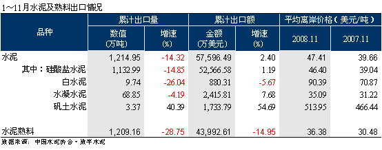金融風(fēng)暴在全球愈演愈烈,世界經(jīng)濟(jì)衰退,出口表現(xiàn)最為明顯。我國水泥出口的主要國家,如美國、俄羅斯等國的經(jīng)濟(jì)均受到巨大動(dòng)蕩,對水泥的出口需求減弱。截止2008年1~11月,水泥、熟料比2007年同期都有所下降,熟料出口大幅下跌,同比減少達(dá)28.75%,水泥出口同比減少14.32%。
