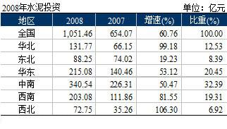 由于2006和2007年水泥市場(chǎng)偏暖,激發(fā)了投資者的熱情,2008年水泥投資快速上揚(yáng)。水泥投資完成1,051.46億元,同比增長(zhǎng)60.76%,高出去年同期近400億元。