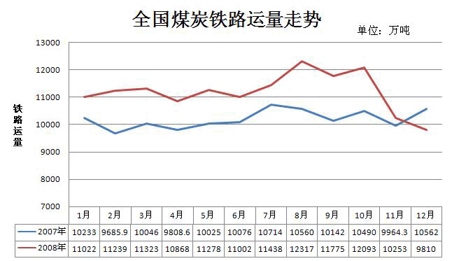 2008年全國煤炭鐵路運量走勢統(tǒng)計