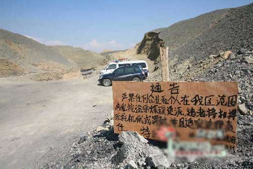 昨日,記者趕到現(xiàn)場時,十幾輛各種型號的汽車停在露天煤礦的礦口處,其中有兩輛救護車,兩輛殯葬車,還有1輛消防車,一塊達坂城區(qū)政府2008年9月5日的通告木牌在風中搖曳。通告內(nèi)容是:嚴禁任何企業(yè)和個人在我區(qū)范圍內(nèi)私挖濫采煤炭資源,違者將扣押采挖機械或罰款,并且追究法律責任。