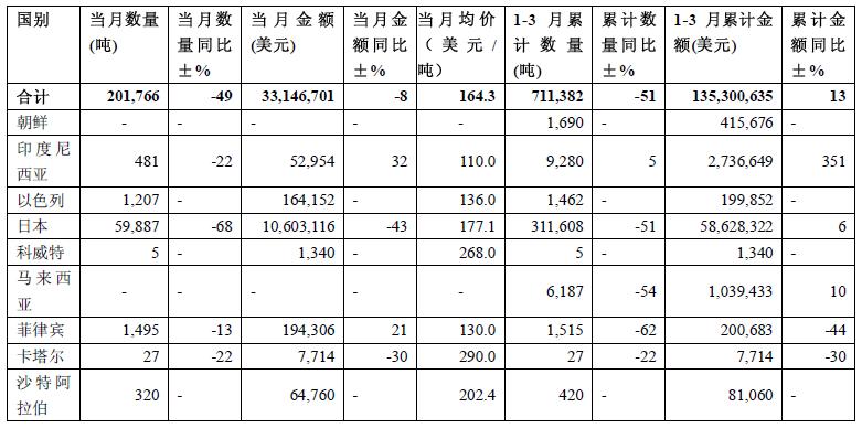 2009年3月無煙煤出口分國別統(tǒng)計(jì)