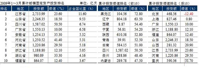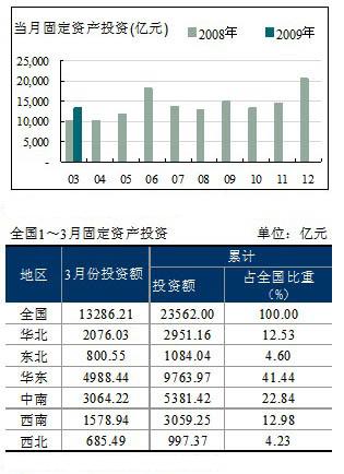 1~3月份城鎮(zhèn)固定資產(chǎn)投資累計(jì)完成額23,562億元,同比增長(zhǎng)28.60%;其中3月份投資完成額為13286.21億元,同比增長(zhǎng)30.31%,投資政策的拉動(dòng)效應(yīng)開(kāi)始顯示。