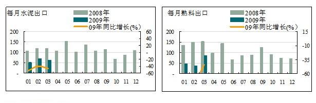 金融危機(jī)對(duì)整個(gè)水泥行業(yè)的影響還在繼續(xù),但程度較上月有所減緩。3月份的水泥出口量為62.83萬(wàn)噸,環(huán)比下降11.12%;累計(jì)出口量184.88萬(wàn)噸,同比下降46.15%;平均離岸價(jià)50.36美元/噸,同比增長(zhǎng)15.13%。水泥熟料出口85.45萬(wàn)噸,環(huán)比上升122.73%;累計(jì)出口量169.67萬(wàn)噸,同比下降61.12%;離岸價(jià)35美元/噸,同比增長(zhǎng)5.78%。
