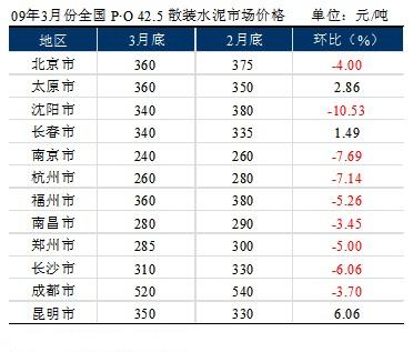 3月份全國(guó)水泥市場(chǎng)價(jià)格較為平穩(wěn)。就統(tǒng)計(jì)的31個(gè)省市情況來(lái)看,有9個(gè)地區(qū)價(jià)格出現(xiàn)不同幅度的下降,其中華東區(qū)4個(gè),中南2個(gè),東北、西南各一個(gè);仍然呈現(xiàn)出“西高東低”的態(tài)勢(shì)。其中,沈陽(yáng)下降幅度最大,為10.53%(40元/噸);價(jià)格上漲城市只有3個(gè),分別為太原、長(zhǎng)春和昆明,漲幅較大的昆明每噸上漲20元。