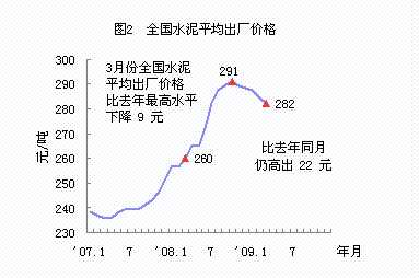 水泥價(jià)格連續(xù)四個(gè)月下降,但全國(guó)水泥價(jià)格總水平仍比去年同期高。三月份全國(guó)水泥平均出廠價(jià)格每噸282元,比去年10月份下降9元,比去年同月高22元(見圖2)。