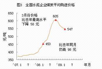 煤炭?jī)r(jià)格下降,但仍處于較高價(jià)位。三月份水泥企業(yè)煤炭購(gòu)進(jìn)價(jià)格平均每噸547元,比去年10月份下降58元,比去年同月高98元(見圖3)。