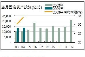4月份城鎮(zhèn)固定資產(chǎn)投資仍然延續(xù)上個月上漲趨勢,當(dāng)月固定資產(chǎn)投資達(dá)到13,520.31億元,同比增長33.96%,較上月再次提高3.65個百分點。