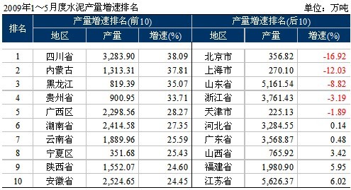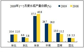 根據(jù)數(shù)字水泥網(wǎng)統(tǒng)計(jì)顯示,1~5月水泥產(chǎn)量57,336萬(wàn)噸,同比增長(zhǎng)13.34%。按產(chǎn)量份額來(lái)看,表現(xiàn)最為明顯的是華東地區(qū)從2008年占全國(guó)的40.8%降到37.5%,下降3個(gè)百分點(diǎn);西南增長(zhǎng)2個(gè)百分點(diǎn),而西北增長(zhǎng)較慢,與之冬季有關(guān),有近5個(gè)月施工淡季;產(chǎn)量增長(zhǎng)最快的是四川,內(nèi)蒙、黑龍江和貴州;北京、上海、山東、浙江、天津?yàn)樨?fù)增長(zhǎng)。